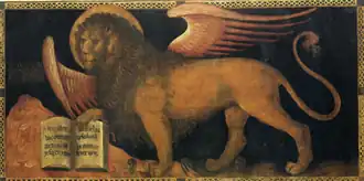 The main overall layout and design of the Venetian banner was kept. The coat of arms of the Region is set in a square in the center of the flag: the Lion of Saint Mark with the opened gospel (reading the Latin motto Pax tibi Marce evangelista meus, "Peace to you Mark, my evangelist") rests its paws on the landscape of Veneto: sea (the Adriatic), land (the Venetian Plain) and mountains (the Alps).[1]