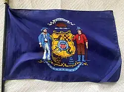 The flag of Wisconsin was adopted in 1863, following requests from Civil War regiments for battlefield use. The legislature formed a committee to choose the specifications for the flag, which was the state coat of arms centered on a field of dark blue. This design was similar to the ones in use by regiments.[4] By 1869 a new state flag was made for the senate chamber in Madison. It was described similarly to the 1863 flag, but with the United States coat of arms on the back.[5] On August 3, 1886 in San Francisco a veterans parade was being held. A group of veterans from Wisconsin carried a state flag describes as: "...banner of crimson, and blue velvet, surcharged with the State arms..."[6] In 1913, it was formally added to the Wisconsin Statues, which specified the design of the state flag.[4]