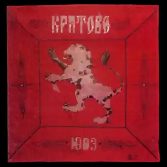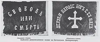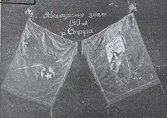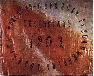 It was sewn by the teachers Fotinka Petrova, Vasilka Stefanova-Pophristova, Aneta Spirova Olcheva, Aspasia Dimova Yakimova, Vasilka Poppetrova-Naranzhova, Vasilka Lazeva Lazheva, Paraskeva Aceva and others, according to a project by the students from Bitola High School Dragan Zografov and Arseni Yovkov. The inscriptions "Freedom or Death" and "Second Mac. Adr. Rev. Reg.: Bitola, Prilep, Lerin, Kostura, Krushovo, Kichevo, Debar, Demir-Hisar" are embroidered on it. On the reverse, on a red background, is written "Dare, people. God is with us", as well as a Christian cross.[2] After the uprising, the flag was brought to Bulgaria, and in 1907 Boris Sarafov was buried with it.[4]
