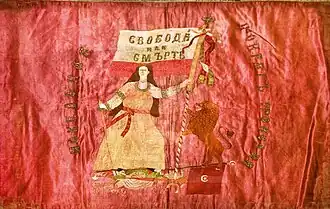 The flag was sewn by Raina Kanazireva and Elena Kalaidzhieva. On a cherry-red silk cloth with white threads, the motto "Liberty or Death" is embroidered in a semicircle, and in the middle a maiden with broken chains.[2]