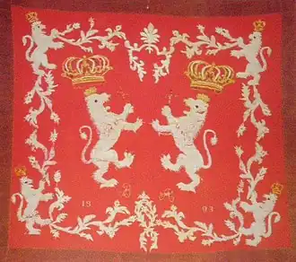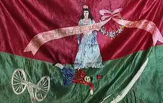 It was embroidered by Ohrid teachers Vasilka Razmova, Konstantina Boyadzhieva, Slavka Chakarova, Poliksena Mosinova. It is made of red silk fabric. It represents a girl with a Bulgarian tricolor in her hand and in it the inscription "Freedom or Death" and an upright lion stepping on a Turkish flag.[7] It is stored in the National military museum in Sofia.[8]