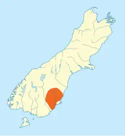Approximate known distribution (in orange) of Galaxias depressiceps on a map of the South Island