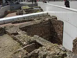 Remains of the Roman military camp have been found at many sites in the centre of Vienna. The centre of the Michaelerplatz has been widely investigated by archaeologists. Here, traces of a Roman legionary outpost (canabae legionis) and of a crossroad have been found.[12] The centrepiece of the current design of the square is a rectangular opening that evokes the archaeological excavations at the site and shows wall remains that have been preserved from different epochs.