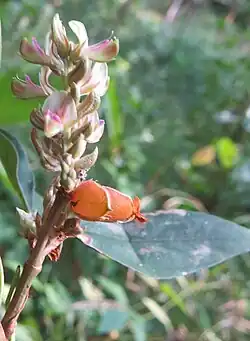 In India it is used as a host plant to the Lac insect, and is sometimes intercropped with food crops during its establishment period. It is also one of the major sources of the resinous powder, called in Arabic ورس (wars), with variants waras, wurs and wurus, obtained from fruits of the plant. It is a coarse purple or orange-brown powder, consisting of the glandular hairs rubbed from the dry pods, principally used for dyeing silk to brilliant orange color; the active compound for it is flemingin. In Arabia, the powder is used as cosmetic.[2]