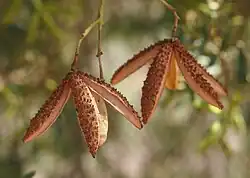 Flindersia dissosperma, commonly known as scrub leopardwood,[2] is a species of small tree in the family Rutaceae and is endemic to eastern-central Queensland. It usually has pinnate leaves with between three and five elliptical to egg-shaped leaves, panicles of white to cream-coloured flowers and fruit studded with rough points.