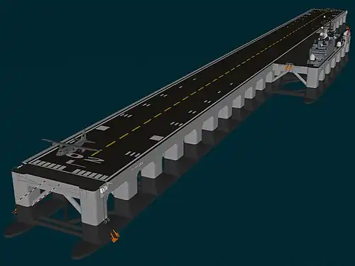 The pneumatic stabilized platform (PSP) was proposed as a means for constructing a new floating airport for San Diego in the Pacific Ocean, at least three miles off the tip of Point Loma.[6] However, this proposed design was rejected in October 2003 due to very high cost, the difficulty in accessing such an airport, the difficulty in transporting jet fuel, electricity, water, and gas to the structure, failure to address security concerns such as a bomb blast, inadequate room for high-speed exits and taxiways, and environmental concerns.[7]