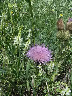 The Mixed Grass Prairie correlates to the Arid Grassland Ecoclimatic Region and hardiness zone 2a and 3a.[18][24] Big sandgrass, blue grama (Bouteloua gracilis) grass grow in the higher dry areas.[24] At lower saline sites alkali grass (Puccinellia alroides), salt grass (Distichlis spicata), foxtail or wild barley (Hordeum jubatum), and arrowgrass (Triglochin maritima) are found.[17] Needle and thread grass, northern wheat grass (Elymus lanceolatus), hair sedge (Carex atherodes), bottle sedge (Carex rostrata) grow in the intermediate mesic sites, with cottonwoods and willow growing along riverbanks.[24]