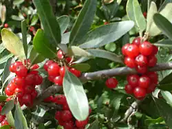 The western parkland has ground cover of plains rough fescue Needle and thread grass (Hesperostipa comata). Tree groves are aspen, willows and balsam poplar.[19] Throughout the Aspen Parkland in low-lying areas with more moisture are dense shrub stands. Saskatoon (Amelanchier alnifolia), pin cherry (Prunus pensylvanica), choke cherry (Prunus virginiana), hawthorn (Crataegus), western snow berry (Symphoricarpos), woods rose (Rosa woodsii), Wolf willow (Elaeagnus commutata) and Canada buffaloberry (Shepherdia canadensis) are a few of the shrubs of the area.[13] The marshes and prairie sloughs of the Aspen Parkland support flora similar to the marshlands of the Southern Boreal Forest.[13] The Aspen Parkland ranges between 1b, 2a and 2b for plant hardiness areas.[18]