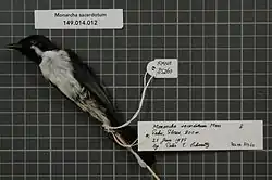 This species was originally placed in the genus Monarcha until moved to Symposiachrus in 2009.[2] Alternate names include Flores mountain monarch, Mees's monarch, Mencke's monarch and Mussau Island monarch.