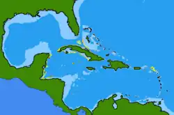 The two original specimens of the Florida torpedo came from a depth of 229 m (751 ft) on the upper continental slope of the western Grand Cayman Bank, in the Florida Straits. This ray has also been observed off the Grand Cayman and San Andreas Islands in the western Caribbean Sea, in both cases amongst scattered coral and gorgonians at depths of 11 and 18 m (36 and 59 ft) respectively.[1][4]