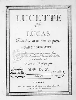 Lucette et Lucas is a one-act comédie mêlée d'ariettes with a libretto by Nicolas-Julien Forgeot. It is a sentimental story of young lovers Lucette and Lucas who must comedically outwit those opposed to their marriage. [1]