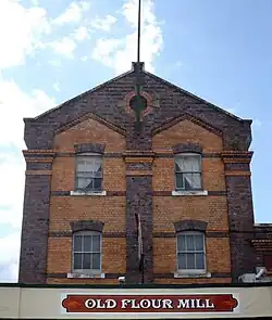 Attached to the eastern side of the mill is a single storey section (the former flour store) with an ornamental parapet bearing the date 1901. Behind this is the former corrugated galvanised iron-clad grain store. The single storey section contains a sandwich shop on the left and a passageway on the right leading to stairs which give access to the former grain store; one set of stairs leads up to a restaurant while the other leads down to a shopping arcade.[1]