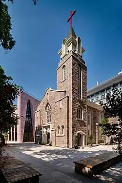 In 1915, Rev. John Gowdy (then superintendent of the Methodist Episcopal Mission) and Rev. Yu Xingli (余兴礼, a Chinese Methodist pastor) purchased on East Street what used to be the mansion of a Ryukyuan king in Qing Dynasty and rebuilt it into a city institutional church named Central Institutional Church or Siong Iu Dong (尚友堂, Foochow Romanized: Siông-iū-dòng, lit. "church for social intercourse").[2] The first baptism was held on September 5 of the same year.[3] In 1938 the building was subsequently reconstructed under charge of Rev. Xu Rongfan (许荣藩) into a large granite chapel capable of holding a congregation of some 1000 people.[2] The building was designed by Lin Jixi (林缉西), a local architect first trained by the Methodist mission´s Union Architectural Service (协和建筑部) in Fuzhou and subsequently sent to architecture school in the USA.[4]