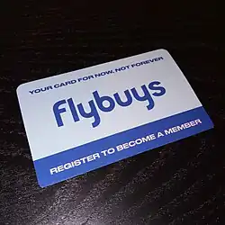 Flybuys is an Australian customer loyalty program equally owned by the Coles Group and Wesfarmers through joint venture Loyalty Pacific.[1] Members can accrue points by shopping at Coles Group brands (Coles Supermarkets, Liquorland, etc.), certain Wesfarmers brands (Kmart, Target, Bunnings, Officeworks, catch.com.au, Kleenheat, etc.), and some third-party partners like HCF Insurance, Coles Express and Optus.[2] Points can then be redeemed for money off purchases at Coles Supermarkets, Coles Express, Liquorland, Kmart, Officeworks, Target and mycar (2,000 points gives an A$10 discount), as well as holidays (through Flybuys Travel or Velocity Frequent Flyer) and household goods (from the Flybuys Rewards Store).[3]
