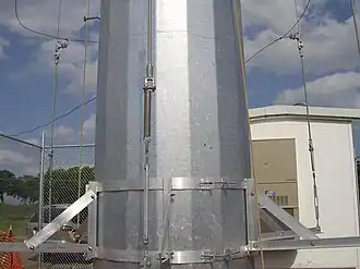 The resulting skirt enveloping the mast connects only at the tower top, or some midpoint near the top, and to the isolated conducting ring that surrounds the tower base; the skirt wires remain insulated from the mast at every other point along its entire length.[1][3]