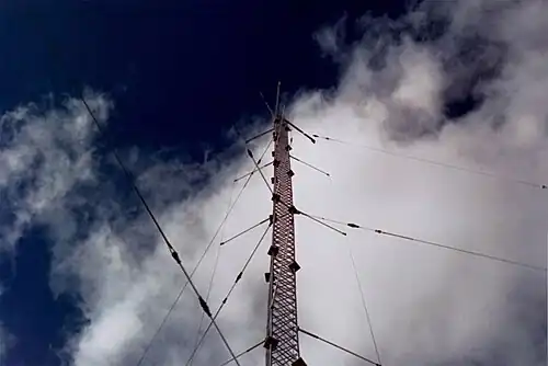 - ^ U.S. patent 6,133,890 abstract: A self-resonant vertically polarized folded unipole antenna for long wave (LW) [and] medium wave (MW) broadcasting, and for the 160 meter amateur radio band with a grounded tower connected to radially descending fold wires terminated near the base of the tower in an open polygonal ring, possibly a C-ring with a reactive load in series with this ring. This reactance cancels the reactive component of the antenna input impedance causing the input impedance to appear resistive at the feed point. This leads to outstanding linearity and bandwidth up to and possibly exceeding plus or minus 16 kHz, sometimes exceeding plus and minus 20 kHz.
