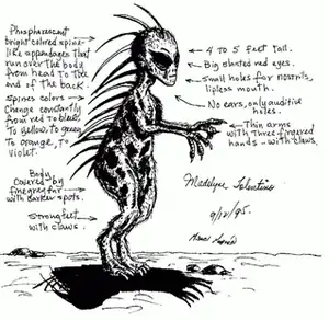 The name, which is inherently satirical in nature, shifted the perception of the attacks from concern to comedy.[68] The name was considered unfortunate both locally and by foreign media, such as Ocurrió Así, where it was argued that it served to repel the intervention of the authorities. Knowing this well, journalist Jorge Martín tried to counteract this popularity and change it to "EBAs". He was responsible for drawing the first sketch of the purported creature, as described by Canóvanas resident Madeline Tolentino, popularizing the image of an otherworldly predator in the general populace. Politicians that tried to push the matter in the HOR opted to avoid using the name directly.[69] Once again, El Vocero would be responsible for promoting a sensationalist series on the Chupacabras, this one focusing on the antics of Canóvanas mayor José Soto and his “Chemo Jones” adventurer alter ego.[70] This persona was born when he embraced mocking comparisons to Indiana Jones and John Rambo that were lobbied at him following eccentric claims that the creature had to be hunted down before attacking humans.[71]