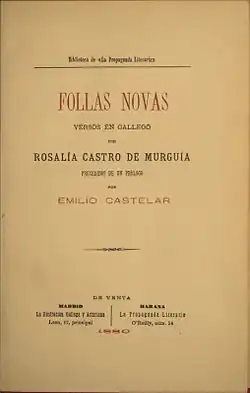 Follas novas (New Leaves) is a collection of poetry by the Galician Rosalía de Castro, published in 1880. It is her second and last collection in the Galician language. The majority of the poems were written during 1869-1870, when the family lived in Simancas, but the collection also includes literary work from the 1870s, part of which had already been published in newspapers.[1] This book is considered one of the fundamental works of Galician literature, which triggered the Galician Rexurdimento.[2]