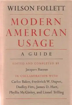 Follett's Modern American Usage is the book published with the title Modern American Usage which was left in draft form and unfinished by Wilson Follett at his death. It was completed and edited by his friend Jacques Barzun in collaboration with six other editors. It is a usage guide for contemporary American English. Modern American Usage covers issues of usage, prose composition, and style, including English grammar, syntax, and literary techniques.