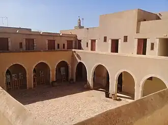 The entrance of the fondouk (or its vestibule) is a hallway with a large wooden door framed by a stone device. Laterally, visit can find built benches and stairs on the left that lead to the first floor.[4] It gives access to a large open-air patio surrounded by sandstone porticos, mounted on limestone pillars. These galleries open on cells covered with semicircular vaults. According to historians, these rooms were reserved for the animals of travelers and their goods.