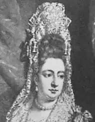 The fontange is said to be named for the Duchesse de Fontange, a mistress of King Louis XIV of France. One version of the story is that after losing her cap while hunting with the King, the Marquise tied her hair up using a ribbon in a manner that pleased him, and this was imitated by the other ladies at court, subsequently spreading across Europe.[3] What started out as a simple headdress of folded ribbon in the 1680s became, with additional fabric, lace and trimmings, taller and more complex, increasingly difficult to create and wear.[5][7] Despite its courtly origins, fontanges were forbidden to be worn at French state occasions, although the English court accepted them, with Queen Mary having her portrait painted wearing one.[5][2]