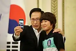 In 2011, the Instagram photo-sharing and social networking service introduced auto filters, allowing users to easily alter their photos.[10] Initially popular with young people, selfies gained wider popularity over time.[40][41] Life and business coach Jennifer Lee, in January 2011, was the first person to coin "#Selfie" as a hashtag on Instagram.[42][43] By the end of 2012, Time magazine considered selfie one of the "top 10 buzzwords" of that year; although selfies had existed long before, it was in 2012 that the term "really hit the big time".[44] According to a 2013 survey, two-thirds of Australian women age 18–35 take selfies—the most common purpose for which is posting on Facebook.[41] A poll commissioned by smartphone and camera maker Samsung in 2013 found that selfies made up 30% of the photos taken by people aged 18–24.[45]