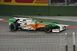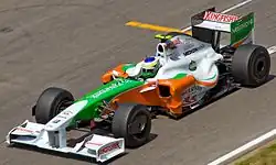 The Force India VJM02 was Force India's Formula One car for the 2009 Formula One season. It was revealed in a low-key press event, after the car's first test at the Silverstone Circuit, on February 28, 2009, before a public test at the Circuito de Jerez in Spain the following day.[3][4] The Northamptonshire-based team's car is decorated in the colours of the Indian flag, and was driven by the same drivers as in 2008 – Giancarlo Fisichella and Adrian Sutil.[3][5]