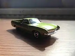 Rancheros are reasonably collectible, though they are nowadays often overlooked in favor of the later-arriving Chevrolet El Camino,[source needed] which stayed in production eight more years. Miniatures, apart from hand-cast resin kits from cottage-industry makers,[22] are rare. Several Revell offerings of the 1957 model in both 1/32 and 1/25 scale have been offered over the years, as has a kit of the 1961 Ranchero by AMT/Ertl. A well-detailed promotional model of 1959 intended for distribution by dealers was offered both with and without interior trim, windows, and friction drive by AMT/Ertl's predecessor, SMP; resin castings of this model's body are offered by the aforementioned cottage industries, as well. Matchbox produced a 1961 Ford Falcon Ranchero for the 2018 line as well as a 1970 Ford Ranchero for the 2023 line. Johnny Lightning makes a 1964 model, Hot Wheels made an adult collectible '57 in a limited run. In 2009 Hot Wheels produced a '72 Ford Ranchero that is still in production today. Hot Wheels also introduced (in 2011) the '65 Ford Ranchero that has a hard tonneau cover on the bed, and an opening in the hood that reveals the engine beneath. Racing Champions made a 1/64 scale 1957 Ranchero and AMT/Ertl currently produces a diecast '57 which doubles as a bank. AMT was responsible for other early dealer promotional models, too, including those of the aforementioned El Camino. Tonka produced a resin toy version of the 1968-69 model in roughly 1/24 scale as part of an auto transporter set; the front end of that toy arguably resembles the 1969 model more closely. In 2019, Greenlight Collectibles introduced 1972, 1973, 1974, and 1976 Ranchero models in 1/64 scale. The 1979 Ranchero was made as a 1/18 scale resin model by BOS (Best Of Show) Models.