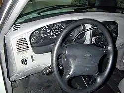 The Ranger EV was essentially a Ford Ranger XL 4x2 regular cab featuring an electric vehicle powertrain instead of the Ranger XL's standard I4 engine. The only difference between a Ranger XL and a Ranger EV was that the Ranger EV had no engine, so the tachometer that was on the Ranger XL was replaced by an estimated range remaining gauge on the Ranger EV, the oil pressure gauge was also replaced with an On/Off indicator, and the voltage gauge was replaced with an economy gauge. Other than these minor differences, the Ranger EV included the standard features that the Ranger XL 4X2 Regular Cab included as standard: an AM and FM radio, two speakers, fifteen-inch alloy wheels, a bench seat or bucket seats trimmed in cloth, air conditioning and a heater, an automatic transmission, two airbags, seating for either two or three passengers, a passenger airbag on/off switch activated by the vehicle's ignition and door key, and vinyl flooring. Additional options, such as a spare tire, a cassette and/or CD player, two additional speakers behind the front seats, power windows and door locks, and keyless entry were also available for all Ranger EVs. Most Ranger EVs were painted in Ford's standard Oxford White Clear Coat with a Flint Gray interior; other exterior colors included: Bright Red, Medium Platinum, Light Denim Blue Metallic, Boysenberry Blue Metallic, and Pacific Green Metallic. No other interior color options were available.