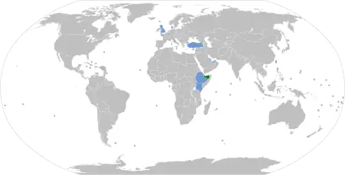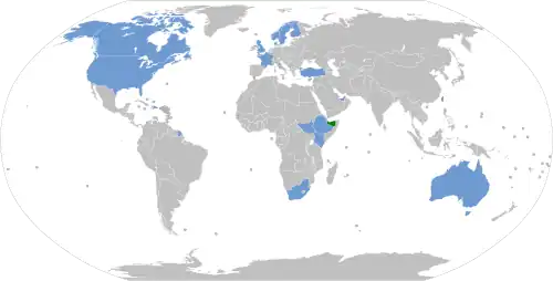 Somaliland has political contacts with neighbouring Ethiopia[9] and Djibouti,[10] as well as with Belgium,[9] Canada,[11] France,[12] Ghana,[9] Kenya,[11] Norway,[11] Russia,[13] South Africa,[9] South Sudan,[11] Sweden,[9] the United Kingdom,[9][14] the United States,[15] and Yemen.[11]