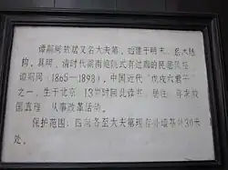 The Former Residence of Tan Sitong or Tan Sitong's Former Residence (simplified Chinese: 谭嗣同故居; traditional Chinese: 譚嗣同故居; pinyin: Tán Sìtóng Gùjū) was built in the late Ming dynasty (1368–1644). It is located in Liuyang, Hunan.[1][2][3][4] The house occupies a building area of 760 square metres (8,200 sq ft) and the total area over 1,200 square metres (13,000 sq ft).[1]