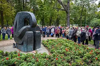 The Formula of Sorrow is a monument to Jewish victims of Nazism, killed in 1941 in the city of Puschkin during the World War II. The memorial is located in the park at the intersection of Dvortsovaya and Moskovskaya streets, not far from the Alexander Palace, near which mass executions took place. In total, about 3,600 Jews were killed in the Nazi-occupied Leningrad Oblast, of which about 250-300 were in Pushkin. During the Soviet era, the Holocaust was hushed up by the authorities. It was not until the 1980s that a group of Jewish activists began to investigate the history of the genocide of Jews near Leningrad (Saint Petersburg). On October 13, 1991, on their initiative, a monument to Jewish victims of Nazism was opened. The central part of the memorial was a sculpture by the cult underground Soviet artist Vadim Sidur "The Formula of Sorrow". The architectural design of the monument was created by Boris Bader. The memorial slab, made as a projection of the Star of David, contains a quotation from the Psalms in Hebrew and Russian, as well as an inscription dedicated to the murdered Jews.[1][2]