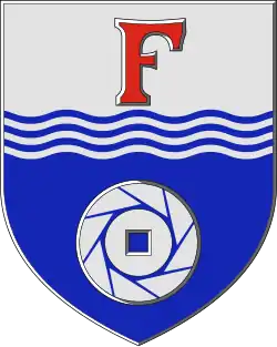 The former coat of arms of Forssa was designed by Arne Wilhelm Rancken in 1947. The coat of arms had a wavy division with a silver waterwheel on a blue background at the bottom part, and three blue wavy lines and a red letter F on a silver background at the top part. This coat of arms was later discontinued as unheraldic.
