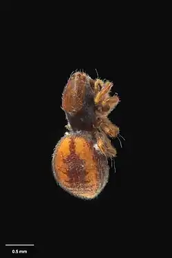 The female is recorded at 2.17mm in length whereas the male is 1.72mm. After being preserved, this species has a dark golden brown carapace. The legs are dark brown. The abdomen is orange yellow with dark brown markings dorsally.[2]
