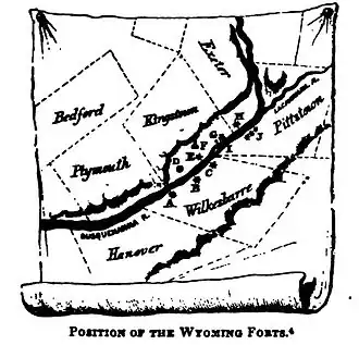 In 1769, Major John Durkee and his men erected Fort Durkee on the eastern bank of the Susquehanna River at the town of Wilkes-Barre, Pennsylvania. The fort changed hands several times during the conflict in the following decade. Fort Durkee was renamed Fort Dickinson in 1783. It was destroyed by Connecticut Yankees the following year during the Second Yankee-Pennamite War.[2]