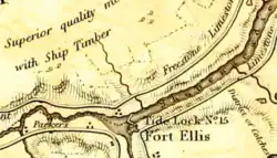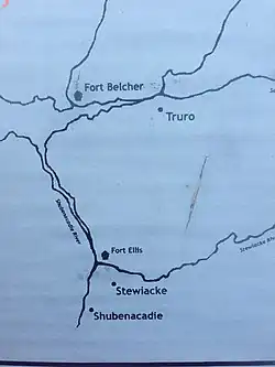Fort Ellis was a British fort or blockhouse built during the French and Indian War, located at the junction of the Shubenacadie and Stewiacke Rivers, close to Stewiacke, Nova Scotia, Canada.[1] The location was labelled Ville Pierre Hebert by Charles Morris. The 14 Acadian families in the area vacated with the Acadian Exodus.[2] Charles Morris recommended a Fort on the Shubenacadie River in 1753.[3] Governor Lawrence first considered the fort in 1754 as a means to protect Halifax from Mi'kmaq raids.[4] Lawrence decided the fort would not be effective until after the Battle of Fort Beauséjour. The fort was completed on October 18, 1761, shortly after the Halifax Treaties were signed.[5] The fort was to guard the new road built to connect Truro and Halifax against Mi'kmaq raids. The fort was called Fort Ellis after Governor Henry Ellis, who was appointed governor weeks after the forts completion. The fort was never garrisoned and eventually abandoned in 1767. Fort Belcher, named after Governor Jonathan Belcher, was built on Salmon River in Lower Onslow, Nova Scotia (1761–67).[6] Fort Franklin was built at Tatamagouche in 1768, named after Michael Francklin and lasted only a year.[7][8] Fort Morris (Nova Scotia) was named after Charles Morris.