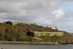 Fort Hubberstone, on the west side of Milford Haven, Pembrokeshire, is a Grade II* Listed Building[1] which belongs to a series of forts built as part of the inner line of defence of the Haven following the Royal Commission on the Defence of the United Kingdom. Together with Popton Fort on the opposite shore, it provided an interlocking field of fire, and represented the last layer of defence before reaching the Royal Naval dockyard at Pembroke Dock. Construction began in 1860 and was completed in 1863 at a cost of £55,000.[2] It is a large battery, with eleven guns in casemates, eight in an open battery above, with another nine in an open flank battery, and a large barracks to the rear. It is a D-shaped structure, with a bomb-proof roof which protected the barracks and other buildings from mortar projectiles. On its landward side, it was protected by a deep ditch, and on the seaward side by a counter-scarp gallery. The associated casemate battery is located further down the headland and separated from the fort.[3]