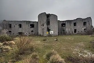 The construction of Fort Kosmač probably began shortly after the border was demarcated in 1841; it was completed around 1850.[7] It was garrisoned by 6 officers and 248 soldiers of various specialities and was armed with 240 mm cannons. During the Krivošije rebellion in 1869, the fort was attacked by a local clan. Its commander Friedrich Merz was shot and killed by Vukale Perov Stojanović from nearby Brajići, who subsequently became something of a local hero and is commemorated in Brajići's church.[8] Merz's death was attributed by the press to his "own imprudence", as he had chosen to take a walk outside the fort while it was under siege from the insurgents.[9] It was not captured and in 1875 it hosted a visit from the Emperor Franz Josef I of Austria.[7]