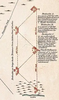 Fort Manhassett's siting and construction was built with a keen eye to the tactical terrain of the marshy plains west of Sabine City. To this day, the area consists of flat salt grass prairie with numerous marshes and several large shallow lakes inland of the beach. These large lakes are generally 6–8 feet (1.8–2.4 m) at their deepest, and the marshes support a huge variety of wildlife. The mile of open ground between Knight's Lake and the beach was selected as the site for the fort, as it was a natural chokepoint, with the road on Sabine Ridge providing a route of resupply and communication with the town. Colonel Valery Sulakowski, chief engineer of the Confederate engineering department in Texas, ordered his subordinate, Major Julius G. Kellersberger, to begin the construction of a series of redoubts, redans, and lunettes on the mile of open saltgrass prairie between Knight's Lake and the Gulf of Mexico.[8] Fort Manhassett consisted of two redoubts, two redans, and one lunette. Redoubt A, Redoubt B, and Redoubt C were built on a straight line, running north to south, between the beach road and the southern shore of the lake. The three redoubts were built to contain a possible enemy advance from the west, and mounted several heavy cannon for that purpose. The two redans in the rear, labelled Flank Defenses I and II on Kellersberg's 1863 map of the Sabine defenses, were intended to serve as a second line of defense in the event of the advance works falling to an attacking enemy. The shell road from Galveston to Sabine City ran between Redoubts A and B. Redoubt C, which was actually a redan, was sited in the marsh, making it inaccessible for artillery when first built;[9] however, it is possible that corduroy roads were later built to allow heavy weapons to be mounted in the work, much in the same manner that machinery and pipe fittings are transported to modern LNG terminals in the salt marshes of the Texas coast.