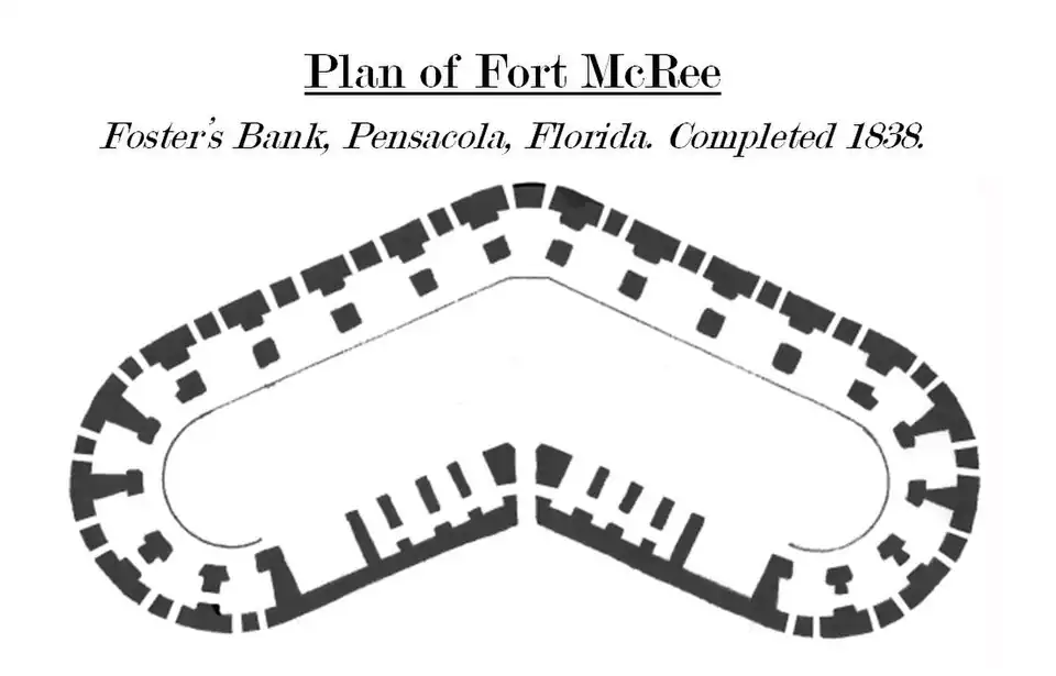 Fort McRee was one of three major installations constructed by the United States to strengthen defenses at Pensacola Bay following the War of 1812. Its construction lasted from 1834 to 1839; the facility was a three-tiered fort and a detached water battery close to sea level. It was located on the eastern tip of Perdido Key on a stretch of beach known as Foster's Bank. It had a highly unusual shape because of its position on a small, narrow barrier island.[1]