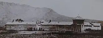 The Agency was built on a commanding bluff about 40–60 feet above the valley floor. Mission Creek (or Skull or Rock Creek - This Creek was actually called "Scraping Hide Creek" by the Crow) flows just to the east of the Fort. The agency fort overlooks the Yellowstone River which is about a half a mile away. The fort / agency was constructed of square-hewn logs, shingle roof, with storehouses and living quarters for the agent, physician, engineer, miller carpenter, blacksmith, and school teacher, storehouses. It had two bastions that served as guard towers. The Agency burned down on October 30, 1872, and quickly replaced by buildings made of adobe, since timber was becoming scarce.