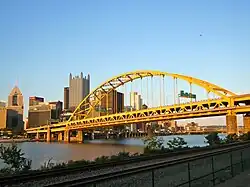 The Fort Pitt Bridge is a steel, double-decked bowstring arch bridge that spans the Monongahela River near its confluence with the Allegheny River in Pittsburgh, Pennsylvania. It carries Interstate 376 between the Fort Pitt Tunnel and Downtown Pittsburgh. Opened in June 1959 as a replacement for the Point Bridge, the Fort Pitt Bridge was the world's first computer-designed bowstring arch bridge[1]: 00:02:43  and double-decked bowstring arch bridge.[2] The bridge is known for its difficult lane changes, especially on the lower level, often requiring people to go from the extreme left lane across two lanes to the extreme right lane in only 700 feet.[3] The upper level is more forgiving for some routes but still requires a full span lane change in 700 feet to get from the south side entrance to the downtown exits.