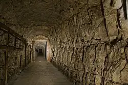 A central spiral staircase from the surface gives access to four main tunnels running radially outward from it at uneven angles. These tunnels lead to the barrack block and caponiers, and past the magazine.