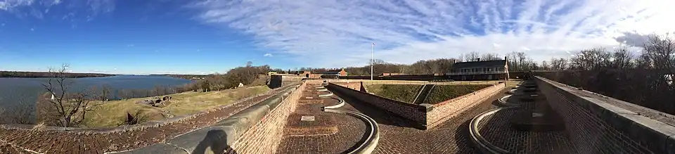 Fort Washington, located near the community of Fort Washington, Maryland, was for many decades the only defensive fort protecting Washington, D.C. The original fort, overlooking the Potomac River, was completed in 1809, and was begun as Fort Warburton, but renamed in 1808.[4] During the War of 1812, the fort was destroyed by its own garrison during a British advance.