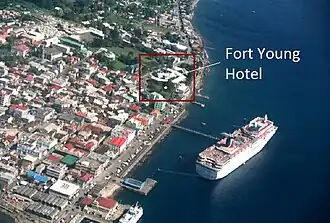 Fort Young Hotel is a hotel on the quayside of Roseau, Dominica, in the southern part of the capital next to Garraway Hotel, Dominica Museum, the Roseau Public Library, just south of the Governor's Residence and Roseau Cathedral.[1] Located within the ramparts of the old colonial military Fort Young of 1770s vintage and built in the backdrop of a quay overlooking the Caribbean Sea, the 71-room hotel was established in 1964 and hosts a diving centre.[2]