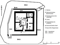 The fort was protected externally by a dry moat and a first enceinte, the braie, defining a peripheral circuit, the lice. This lice was, in case of need, defended by a clever device of horizontal removable posts. In the north east corner of the braie, a broken stretch of wall suggests the location of the access bridge. The modern footbridge now stands there. The shortest distance from the bridge to the entrance to the fort obliged an assailant to go left along the wall, exposing his right side, the most vulnerable because not protected by armour.[1]