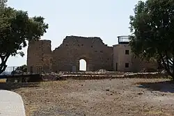 The interior was occupied by lean-to buildings whose roofs fed a central cistern of approximately 40m3 capacity. The surrounding wall, which reached a height of at least 11 m, supported a round walk and, certainly, crenellation. To the left of the door, traces of projecting stones suggest the presence of a staircase giving access to the round walk. In the north east corner, opposite the bridge, stored stones are witness to a project to build a keep, never completed. Three materials were used in the construction. Basalt was used for the centre of the surrounding walls, all of the upper parts and for the external enceinte. The basalt came from the digging of the moat. Volcanic breccia, a conglomerate, was used for the parts of walls above a height of 7 m. This rock was taken from a quarry on the east flank of the hill. Limestone from Pézenas was used in the construction of the cistern and the entrance door.[1]