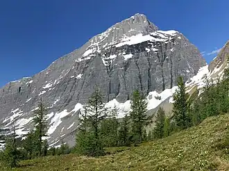 Foster Peak is a 3,201-metre (10,502-foot) mountain summit located on the western border of Kootenay National Park. It is the highest point in the Vermilion Range, a sub-range of the Canadian Rockies of British Columbia, Canada. Its nearest higher peak is Mount Ball, 14.96 km (9.30 mi) to the northeast.[2] The mountain is part of what is known as The Rockwall. Floe Lake, southeast of the peak, is one of the beauty spots of Kootenay National Park. The area is accessible via the Floe Lake Trail and Rockwall Trail. The Rockwall Trail is a scenic 55 km (34 mi) traverse of alpine passes, subalpine meadows, hanging glaciers, and limestone cliffs, in some places in excess of 900 m (3,000 ft) above the trail.[8]