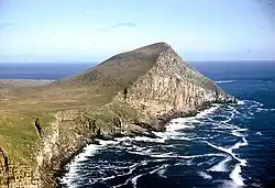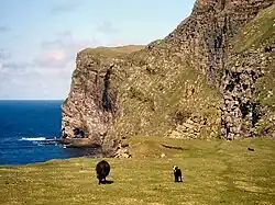 The island's 370-metre (1,210 ft) cliffs are home to numerous birds, including Arctic terns, red-throated divers and great skuas, and birders make up the bulk of visitors to the island.[8] The island has been designated an Important Bird Area (IBA) by BirdLife International because it supports large colonies of cliff- and moorland-nesting seabirds.[18]