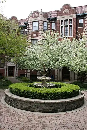 Fountain Plaza Apartments is a historic apartment building at 830-856 Hinman Avenue in Evanston, Illinois. The three-story brick building was built in 1922. Swedish-born architect John A. Nyden, who also designed multiple other apartment buildings in Evanston, designed the building in the Classical Revival style.[2] The building's design includes Palladian doors with fanlights, limestone quoins, and a hip roof with parapets and a cornice. The central courtyard is both raised and nearly surrounded by the building, providing privacy despite the building's proximity to a commercial district.[3][4]